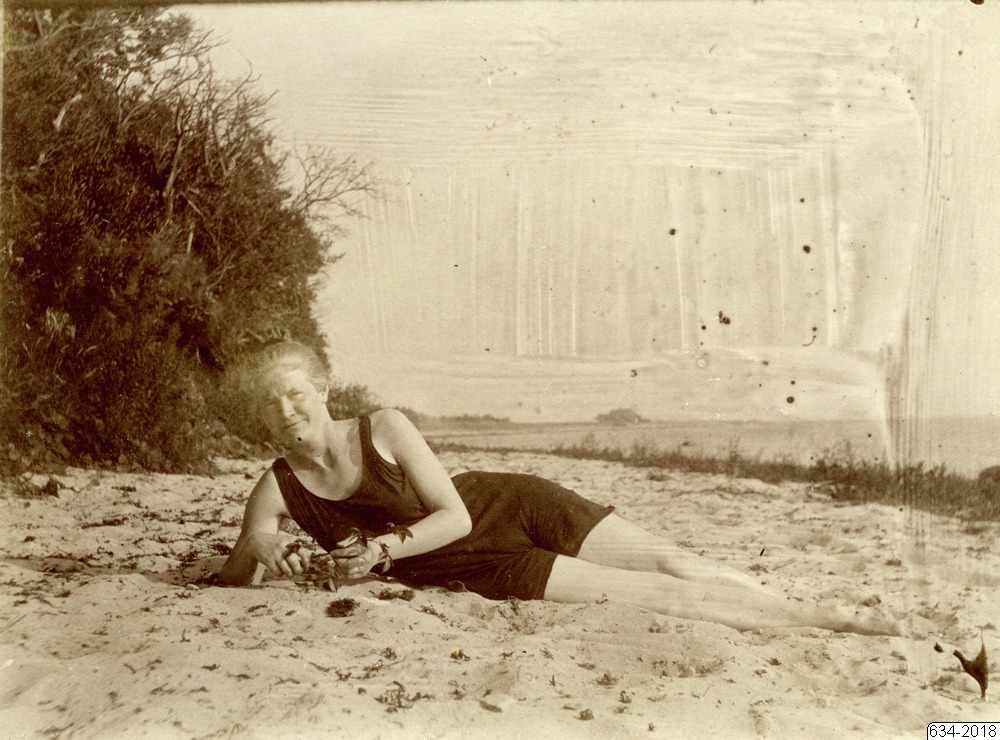 Bilden föreställer en kvinna liggandes i sanden på en strand iklädd baddräkt. I bakgrunden till vänster buskar och till höger hav.