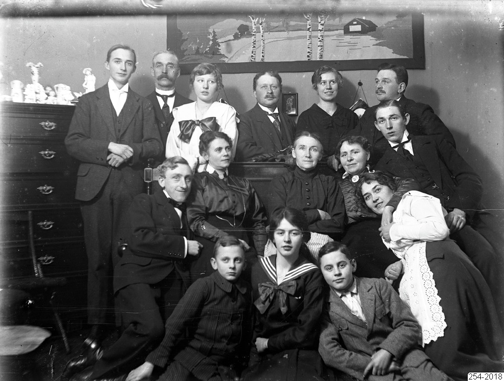 Bilden föreställer 15 personer stående och sittande i ett vardagsrum för ett grupporträtt (kvinnor och män). I bakgrunden hög byrå och nederkanten av tavla.