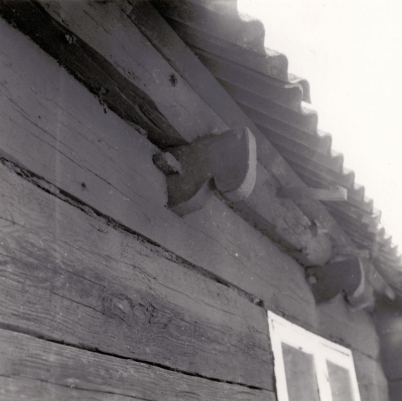 Bunkagården år 1971. Knuttimrat uthus. Bjälkhuvuden på norra sidan, detalj.