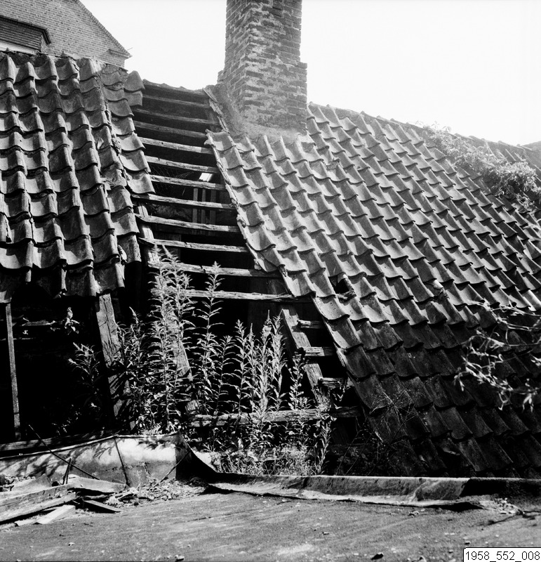 Bilden föreställer en stadsmiljö. På bilden ett tak med tegelpannor, där en del är bortplockade. På taket en skorsten.