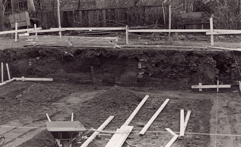 Bilden som är intagen mot söder visar en byggnadsplats, ett schakt för husgrunder på Långvinkeln västra 49, år 1971. På bilden syns olika typer av byggandsutrustning (t.ex. skottkärra, träplankor, en motordriven maskin, mm). I bakgrunden syns flera bostäder.