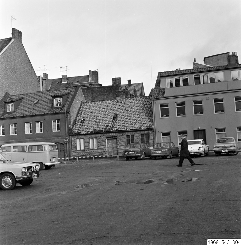 Bilden föreställer en stadsmiljö. I förgrunden en parkering med bilar. Där bakom ett enplanshus inklämt mellan flervåningshus.