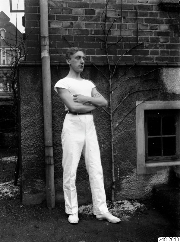 Bilden föreställer en man i helfigur, klädd i byxor och t-shirt stående framför en del av husfasad med stuprör och fönster samt ett nyplanterat träd.