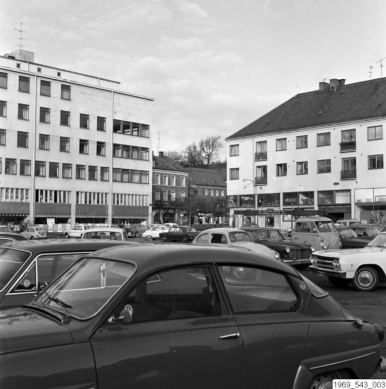 Bilden föreställer en stadsmiljö. I förgrunden en parkering med bilar med en SAAB i förgrunden. Till vänster är HD-huset i kvarteret Najaden. Till höger Boreushuset i kvarteret Erik Dahlberg. Däremellan skymtar Konsul Olssons plats.