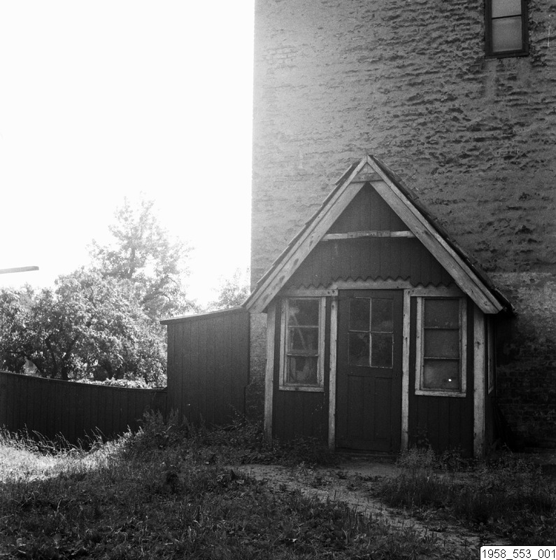 Bilden föreställer en stadsmiljö. I förgrunden en gräsbevuxen yta. Till vänster ett staket och till höger en husfasad med en liten utbyggnad nederst.