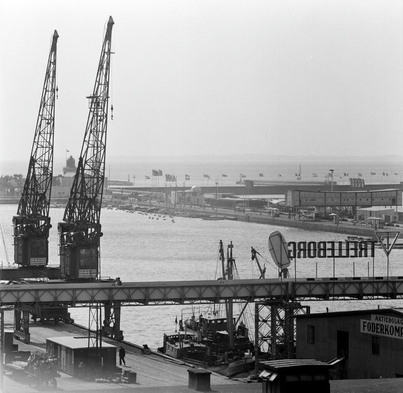 Bilden föreställer i förgrunden ett tak, där bakom en vy över hamn och utställningsområde. Mitt i bild en gångbro. I förgrunden även en byggnad med texten xxxx Foderkompaniet, där ligger också ett fartyg. Till vänster i bild två lyftkranar.