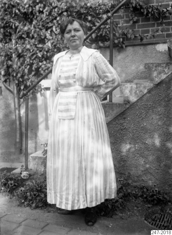 Bilden föreställer en kvinna i hellång klänning stårende framför en husfasad och en utvändig trappa. Till vänster ett träd.