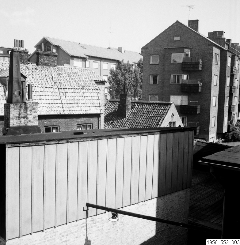 Bilden föreställer en stadsmiljö. I förgrunden någon form av uthus. I bakgrunden husfasader på flervåningshus och tak.