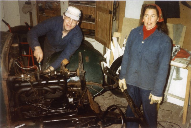 Här arbetar man med renoveringen av motordelarna på Fredriksdals gamla Ford under inspektion av Inger Brandin, som i vanliga fall arbetar i trädgården.