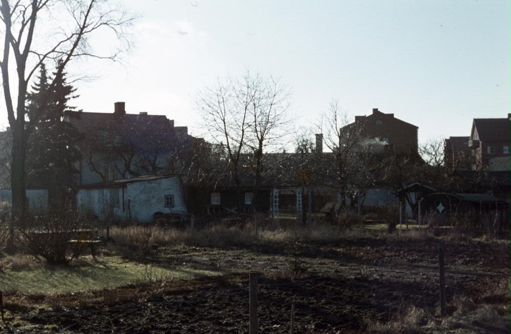 Koloniområdet på Husensjö mosse. I bakgrunden, till vänster syns huset med adressen Husensjövägen 17. Husen i bakgrunden till höger ligger på Jönköpingsgatan.