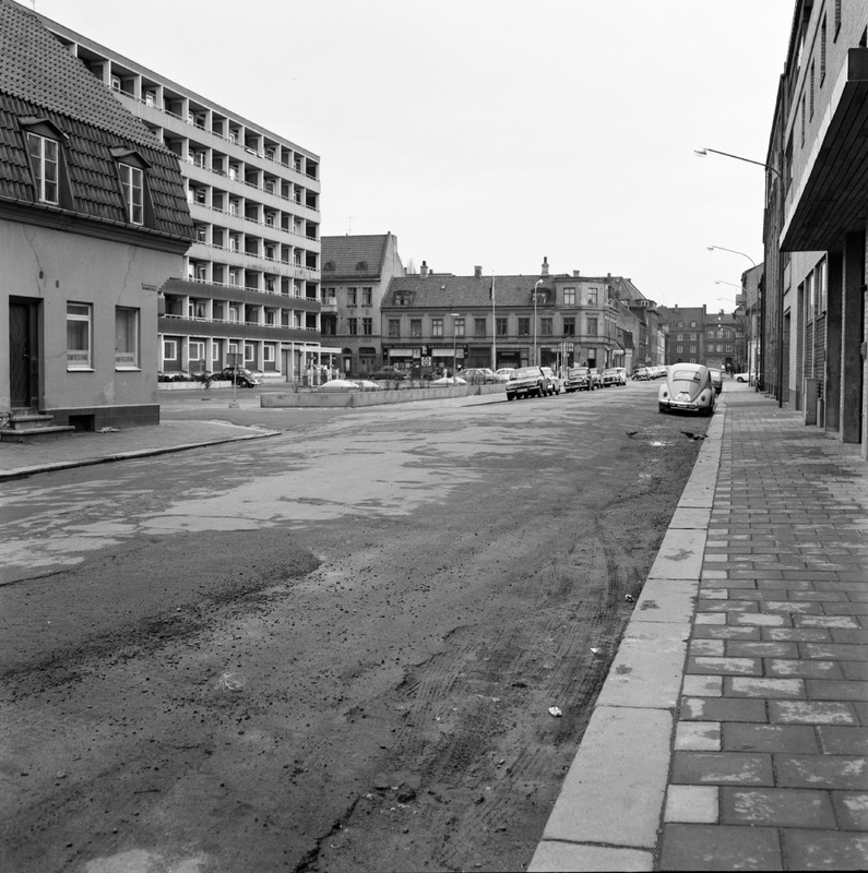 Bilden föreställer en stadsmiljö. I centrum av bilden en stadsgata omgiven av byggnader, parkering och parekerade bilar.
