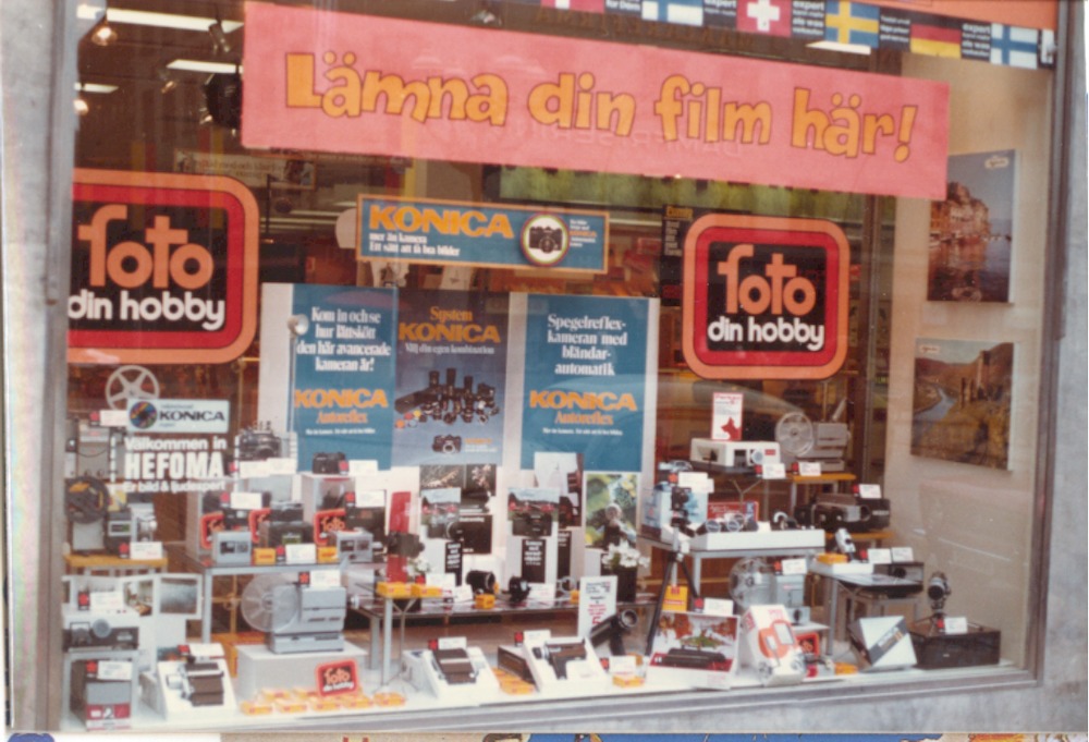 Fotografi som avbildar ett skyltfönster i Hefomas affär på Stortorget 16, i fönstret ser vi reklam för Konica tillsammans med kameror, projektorer och andra prylar. Bilden är tagen på 1970-talet.