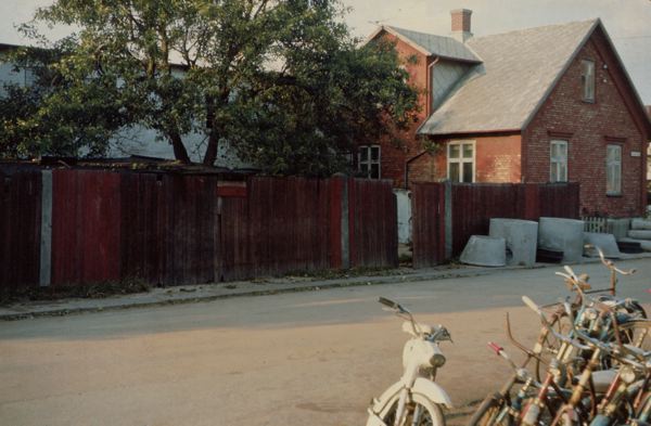 gatumiljö i Höganäs, vattenfabriken. Över gatan till höger ligger betongrör till avloppsledningar. Något är på gång i kvarteret.