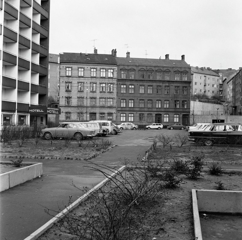 Gustav Adofsgatan med Kv. Skalbaggen, fotograferat från Kv. Böhmen med Frälsningsarmens Hotel.