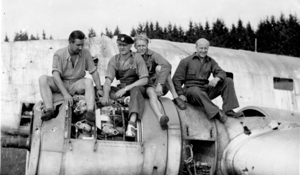 Fotografi av en tysk flygkyrkogård där de militära planen är märkta med hakkors. På ett av planen sitter fyra män.