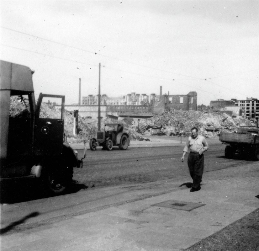 En lastbil från Linjebuss har stannat i en tysk ruinstad, ev. Hannover.