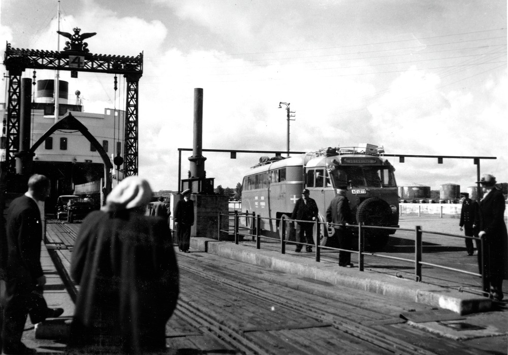 Fotografi av hur en Linjebuss kör av en färja.