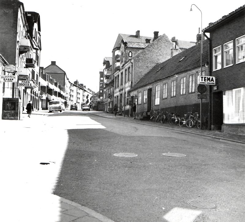 En bild av Långvinkelsgatan, före rivningen av några hus, på bilden syns Tema, Park Hotel och Margareta boden.
