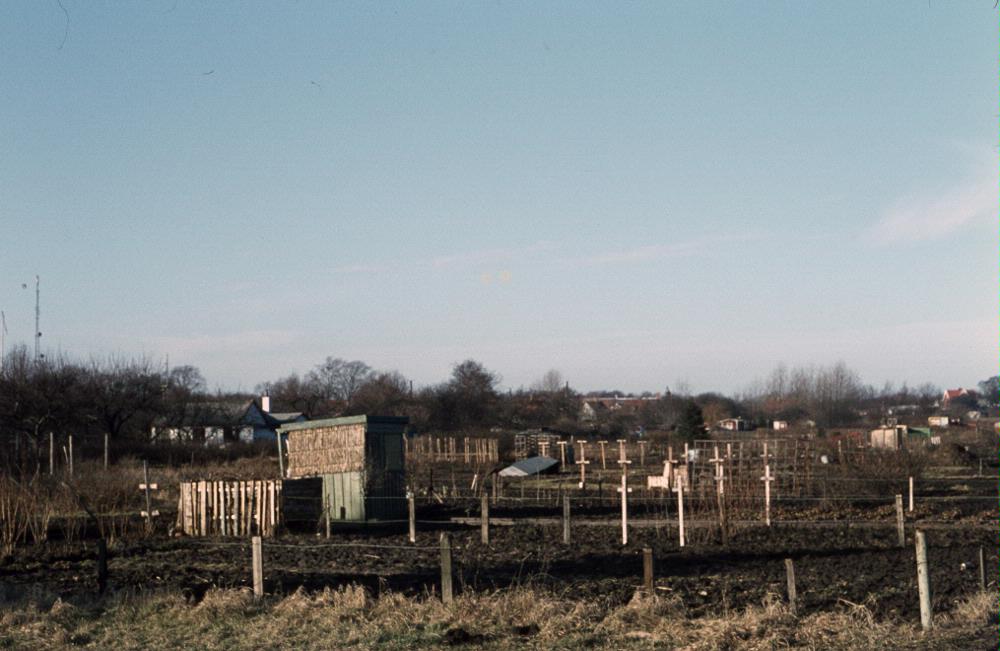 Bilden visar odlingslotter på Meijlings mark på Husensjö mosse (Måsen). Det vita huset i bakgrunden till vänster har adressen Arbogagatan 13. I bakgrunden skymtas mejeriet på Fredriksdal.