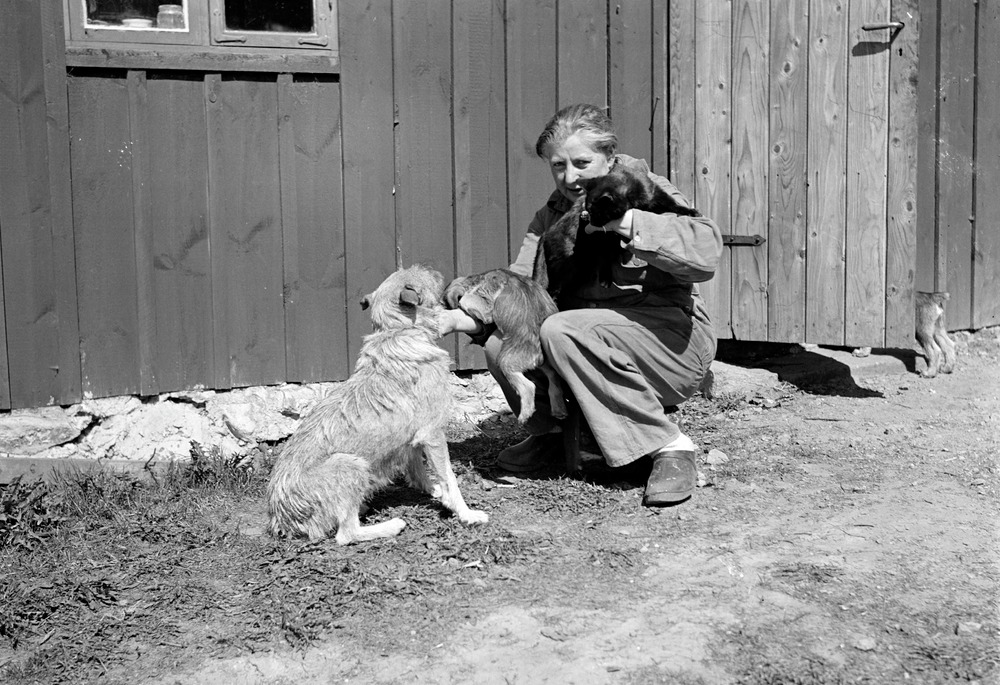 Bilden föreställer Astrid Aagesen i hennes hem Smedjetorpet på Hallandsåsen i Grevie. Hon sitter på huk vid en vägg och i famnen har hon en katt och en valp. Framför henne sitter en hund som hon kliar under hakan. Astrid är klädd i arbetsoverall, raggsockar och träskor.