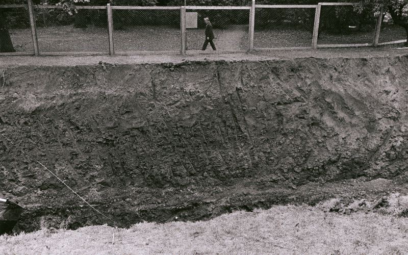 Bilden visar en schaktnings plats i öst-västlig riktning mot Bergaliden år 1971. På bilden syns spår efter grävningsarbete med jordvallar. Gräv och byggplatsen är omringad av ett staket som syns i bakgrunden.