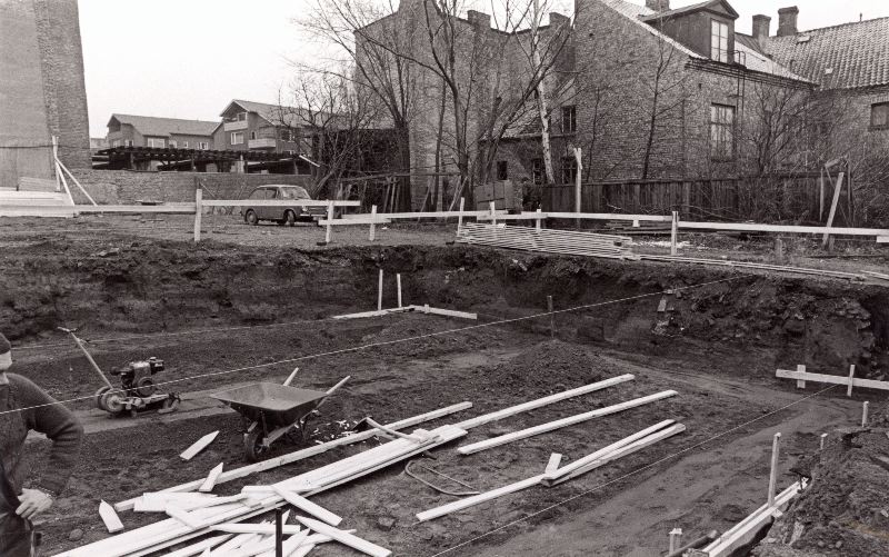 Bilden som är intagen mot sydost visar en byggnadsplats, ett schakt för husgrunder på Långvinkeln V49, år 1971. På bilden syns olika typer av byggnadsutrustning (t.ex. skottkärra, träplankor, en motordriven maskin, mm). I bakgrunden syns några bostäder och en parkerad bil.