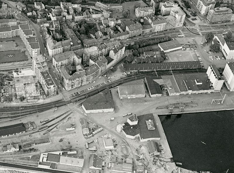 Flygbild över Norra hamnen med silosarna, järnvägen, Tågagatan och Drottninggatan. På fotot står skrivet med tusch: "--- 2 juni kl 19.32-19.35"