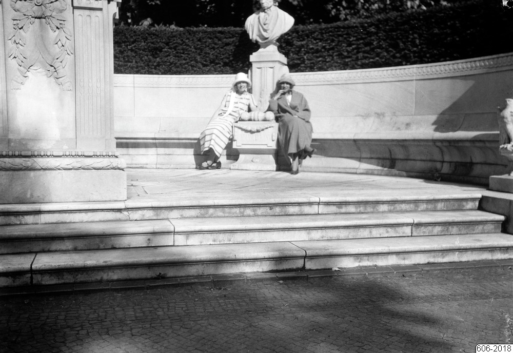Bilden föreställer två kvinnor sittande vid ett fundament till en staty iform av en byst. Till höger del av annat fundament. I förgrunden tre trappsteg. (Jämför 605-609)