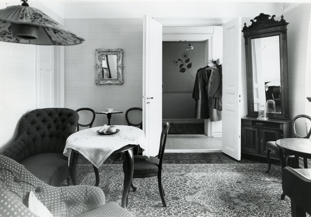 Svartvit fotografi. Interiör från folkskollärare Inez Bolanders hem.
