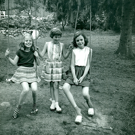 Agneta T. i mitten min "bästis" i flera år. Elisabeth Madgård i diadem och vit blus, blå kjol med sparveck (skulle släppts ner) och träskor.