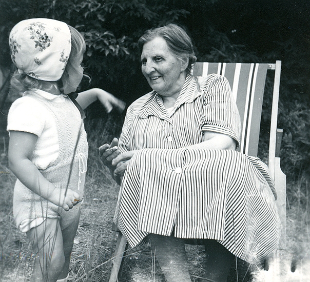 Sommaren 1955. Veronika i vit hätta med rosor. Judit Abrahamsson i klänning i franska flaggans färger. Sparkdräkten i ljusgult stickad av Birgit, babydockan ärvde den.