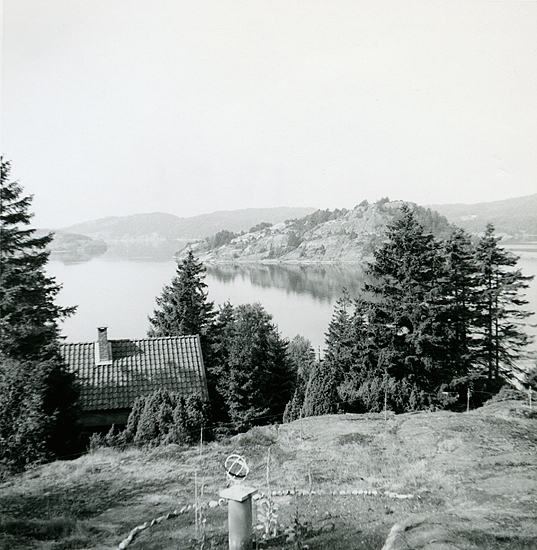 Sommaren 1959. Wetterlunds hus, till vänster soluret. Detta avbildade Gunnel på morfars ex libris. Vilken härlig lättskött tomt! Det var innan Verner började med trädgård på Blekinge-vis.