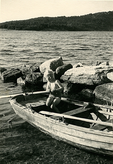 Sommaren 1940? Nils Göran i vår orusteka vid cementdelen mellan Erikssons och ångbåtsbryggan. Eriksson köpte båten av Erik en regnig sommar när han var trött på att ösa ekan.