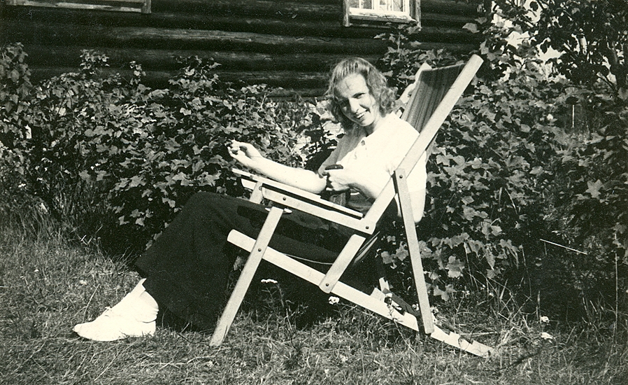 Sommaren 1940 ? Birgit i vida långbyxor och tennisskor utanför ett hus som inte är vårt (panel på bredden) Foto:?.