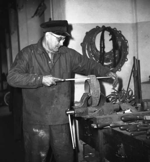 Arbete i verkstaden på Forsviks bruk. Helmer Boström filar gjutgods.