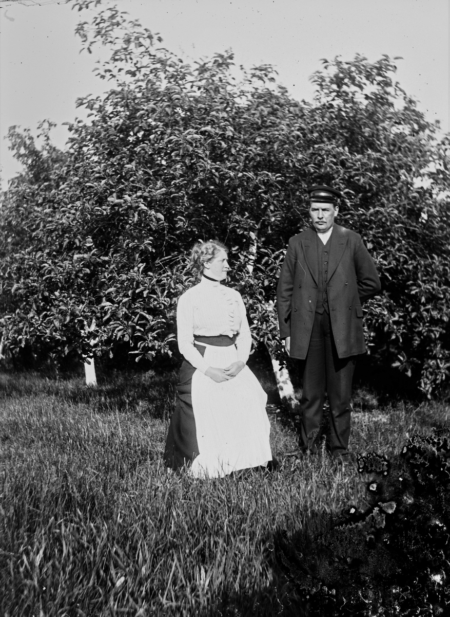 Troligen paret Ahlberg i sin trädgård, där fruktträdens stammar vitkalkats till skydd mot för stark värme och insekter.