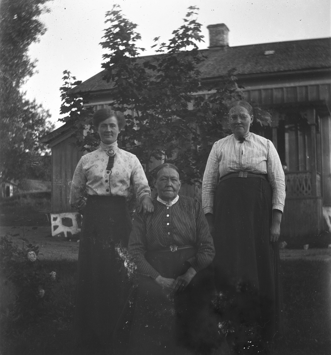 Tre kvinnor vid en rosenbuske framför bostadshuset. Troligen är de ur tre generationer i familjen. (Se interiörbild nr GEB233)