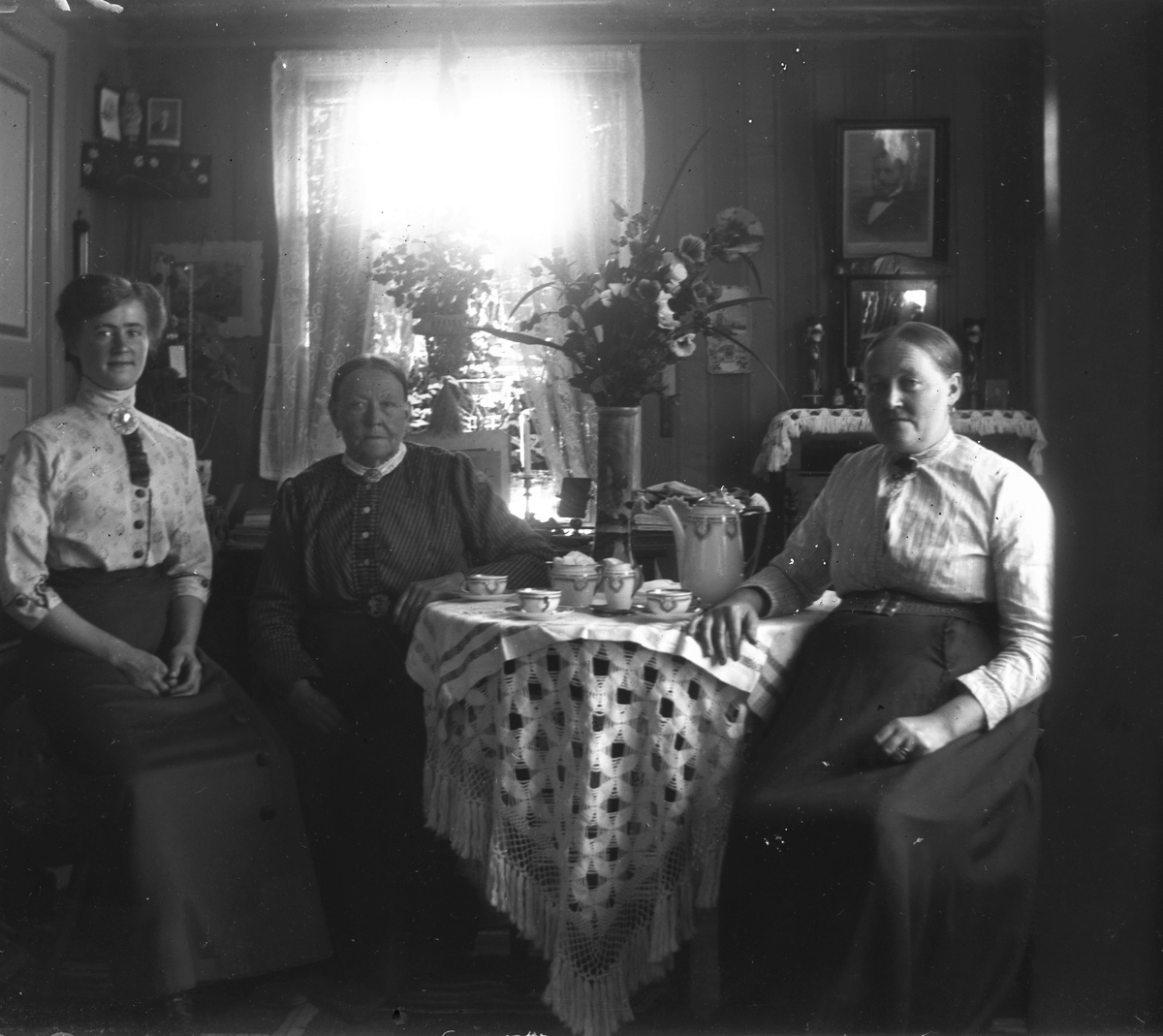 Tre kvinnor dricker kaffe vid ett runt bord. De kan vara ur tre generationer i huset och är alla klädda i blus med brosch halsen, långskjolar och skärp. En stor blombukett i hög vas pryder bordet. De har en rullgardin nerdragen med ett landskapsmotiv.