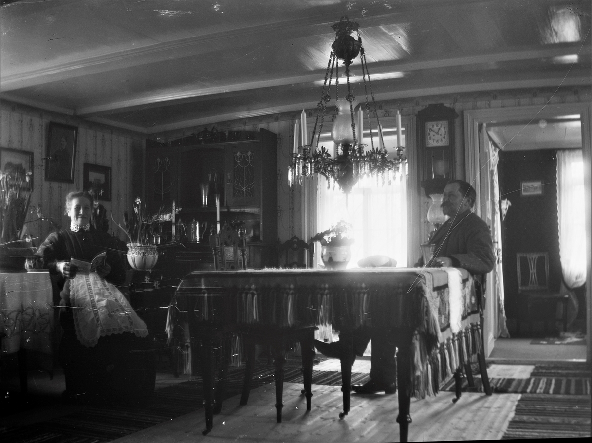 Ett par sitter vid ett stort bord på små hjul i finrummet. Han håller i en tenn- eller silverbägare, som nog just tagits ut ur jugendskänken där ena dörren står öppen. Hon sitter med ett häfte vid andra kortsidan, omgiven av vårblommor som narcisser och hyacinter i krukor. Bordsduken är tjock och försedd med långa fransar och en takkrona för både fotogen och ljus hänger däröver. (Mannen ser ut att vara en av nämndemännen i Viske häradsrätt som ses på bildnr GEA094)