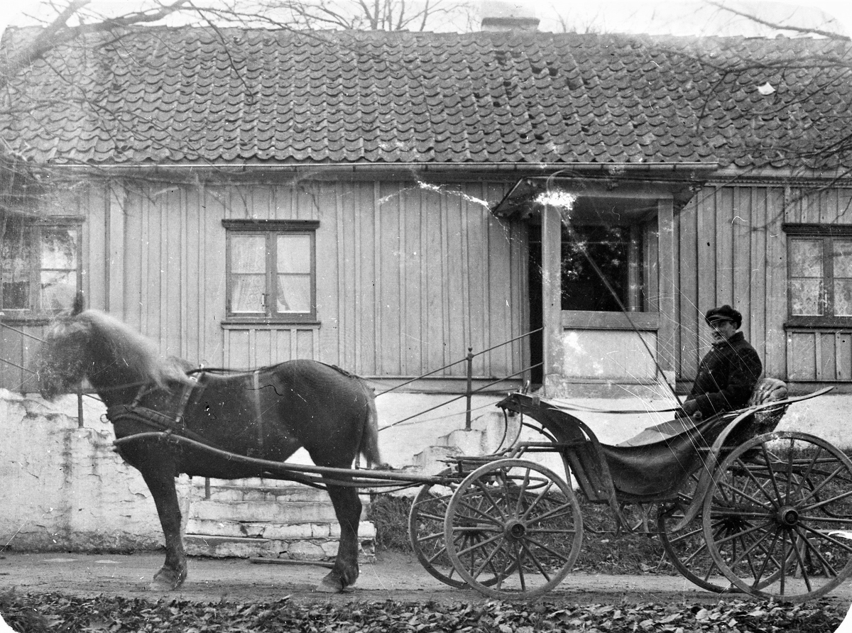 Arrendatorn av Veddige Prästgård, Johan Svensson, sitter i hästdragen vagn vid folkskolan i Sällstorp, Lugnet. Skolan stod klar 1865.