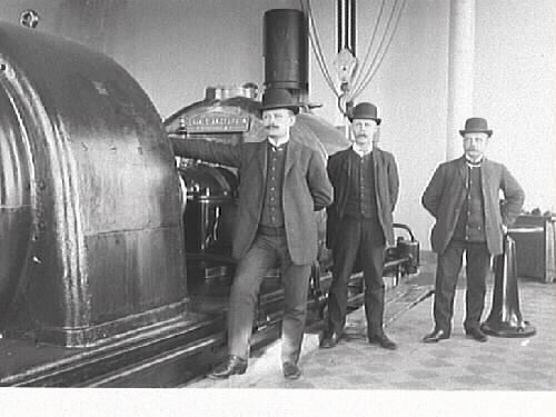 Interiör från Varbergs Ångkraftverk, uppfört 1908 i Varbergs hamn som reservkraftverk till Yngeredsfors kraftstation i Ätran, uppfört 1907. Männen i kubbar bredvid ångturbinen är fr v: herr Östlund från ASEA, herr Lundberg från Yngeredsfors Kraftverk AB och herr Lundgren från de Laval. (Se även bildnr MR2_921)