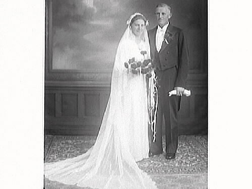 Brudparet herr och fru Otto Svensson från Valinge. Bruden har lång slöja som breder ut sig på golvet och en rosenbukett. Brudgummen bär frack.