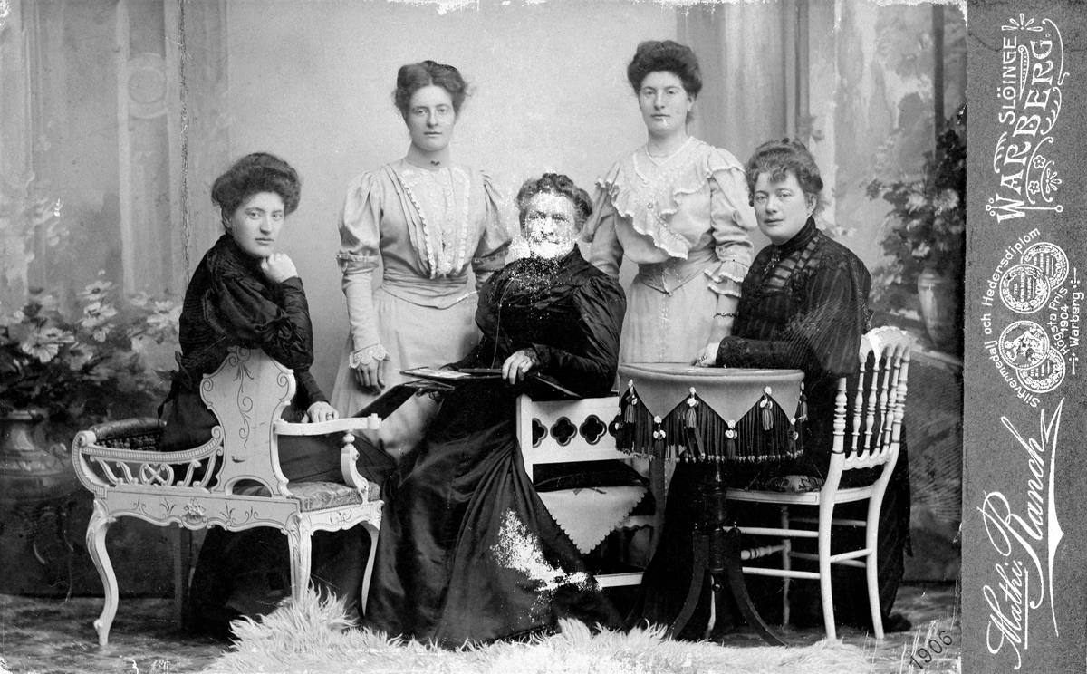 Ateljéporträtt av Anna Maria Katarina Svensson i mitten (kallad Marie), omgiven av sina döttrar. Fr v med namn som gifta: Julia Welander, Anna Geijer, Marie själv, Olga Svensson och Emma Rosander. Fotografen har använt sig av tre sittmöbler, ett pelarbord och en fäll på golvet i förgrunden. (Fotografiet har nötningsskador på mitten, dvs på Marias ansikte)