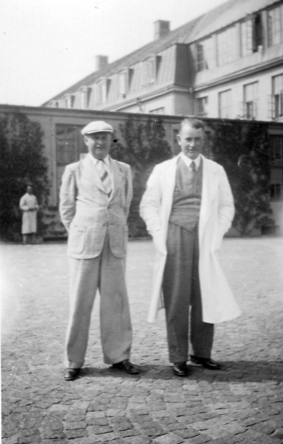 Till vänster står Carl Ahlin, syssloman på Kustsanatoriet Apelviken åren 1931-1951. Mannen bredvid honom är okänd. I bakgrunden står ytterligare en man i rock. De står ute på den gatstensbelagda gården med sanatoriebyggnaderna i bakgrunden.