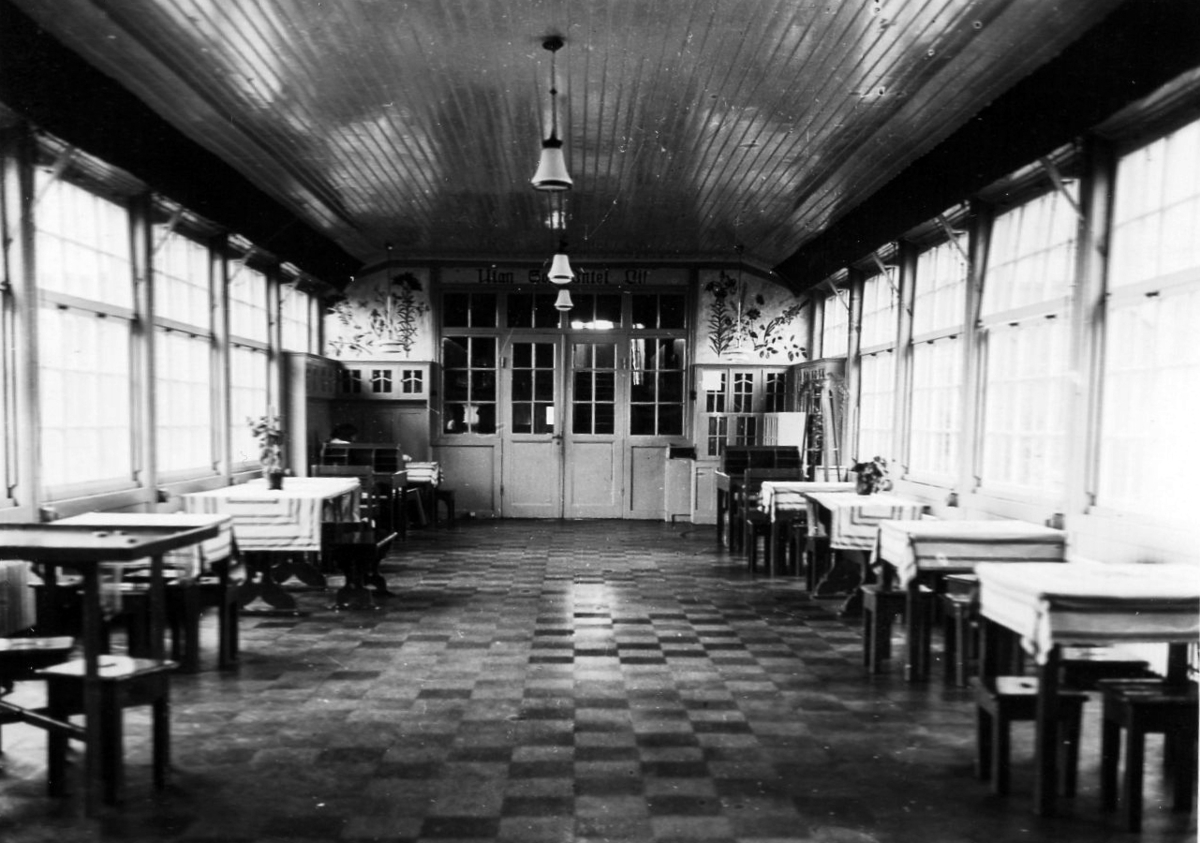 "Blå Hallen mellan kliniken och avd 6" står det på fotots baksida. På var sida om det stora dörrpartiet finns upptill växtdekorer. Golvet är rutigt och längs de uppglasade väggarna står små bord med dukar på och pallar till. Till vänster står ett högre bord som ser ut att kunna vara något slag av spelbord.