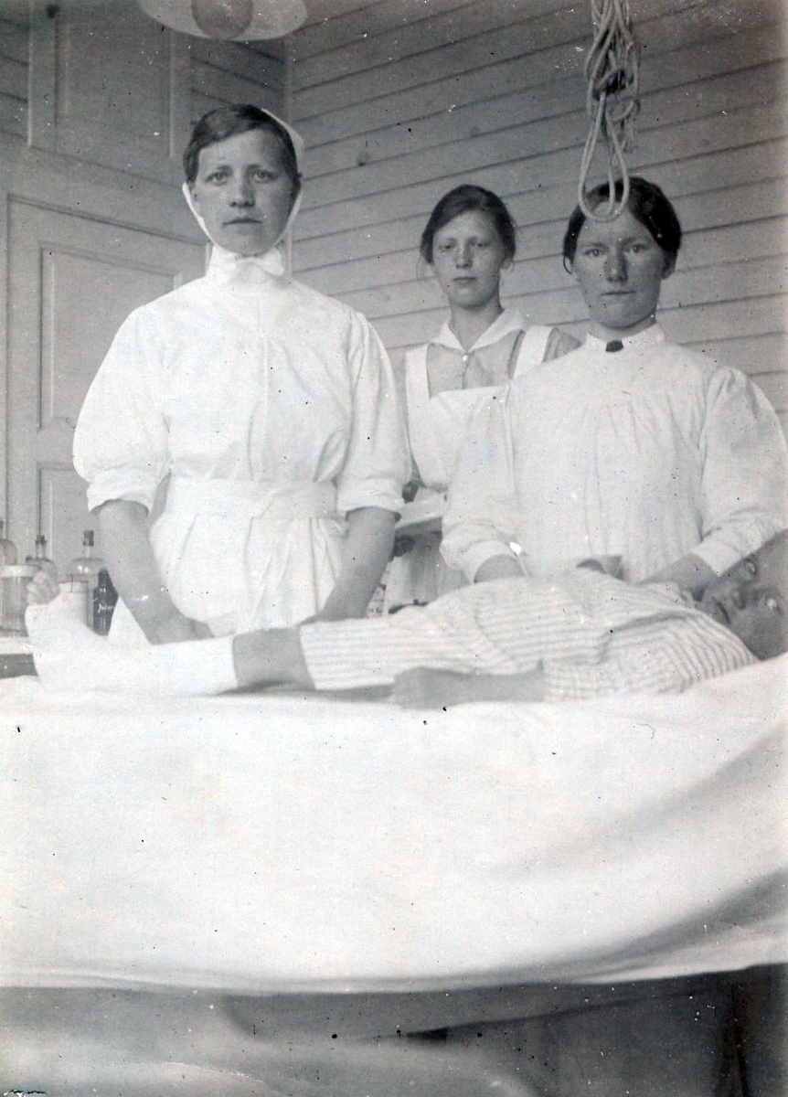 "Minne från Apelviken den 15/6 1918" står det på fotografiets baksida. Tre unga sjuksystrar på Kustsanatoriet står vid bädden där ett litet barn ligger med ena foten gipsad. Fr v: Syster Signe, fröken Törngren, fröken Boström.