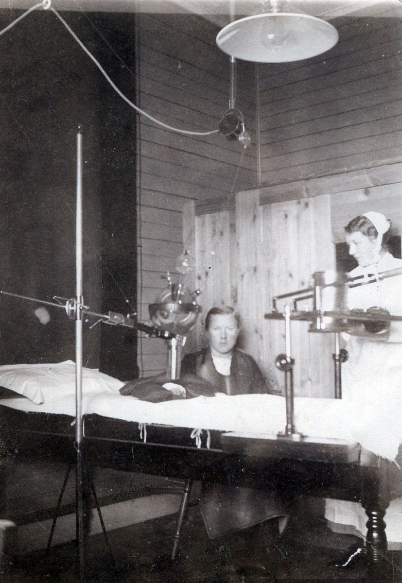 En flickas gipsade arm röntgas på Kustsanatoriet Apelviken av en sjuksköterska. Patienten har ett förkläde på sig som sannolikt ska skydda mot röntgenstrålarna. Röntgenstrålningen upptäcktes 1895 av Willhelm Conrad Röntgen som för detta fick Nobelpriset i fysik 1901.