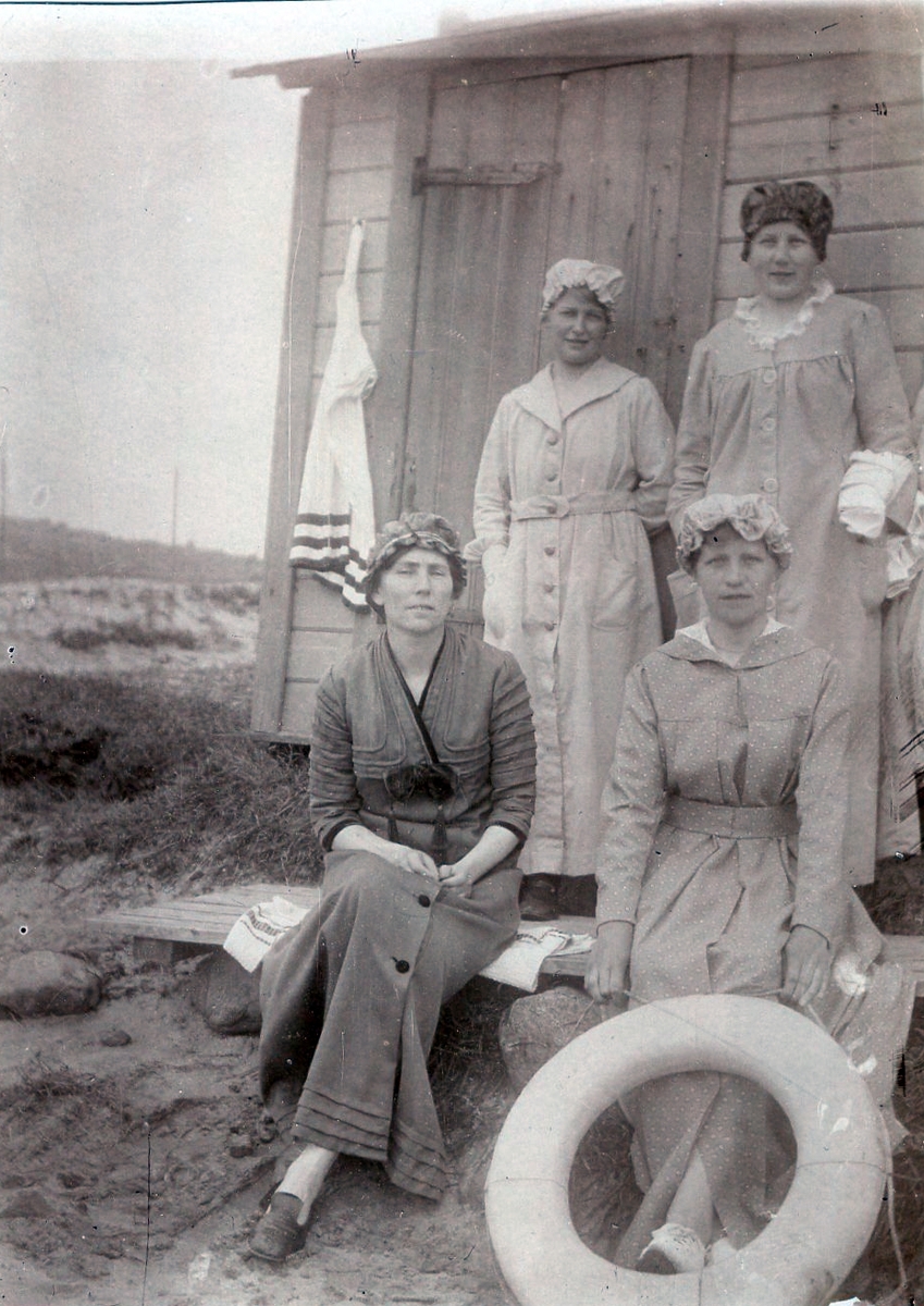 Fyra kvinnor med badmössor och badrockar vid en omklädningshytt, Kustsanatoriet Apelviken. En baddräkt hänger bredvid dörren. Troligen är det personal på sanatoriet och eventuellt syster Signe som sitter med badringen/livbojen. (Se bildnr KSA02)