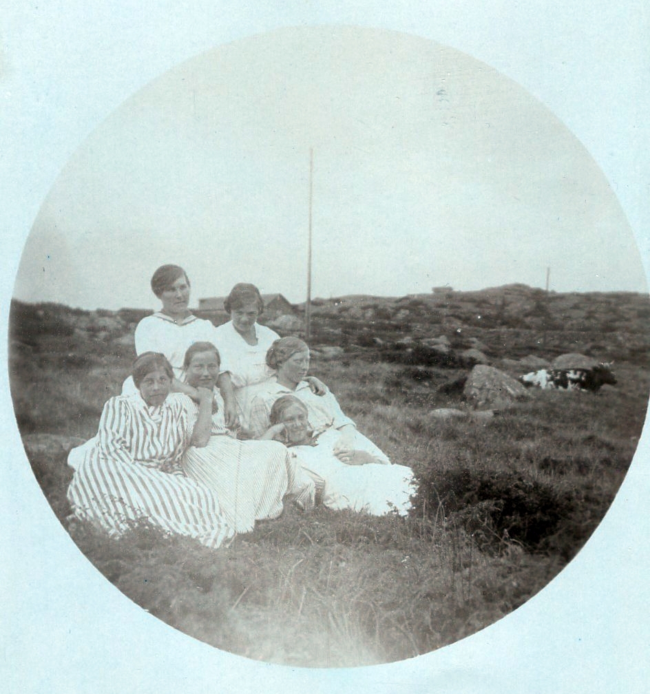 Runt motiv på beskuret vykort. Sex unga kvinnor samlade ute i gräset vid Kustsanatoriet Apelviken. I bakgrunden ligger en ko. Troligen är de personal vid sanatoriet.