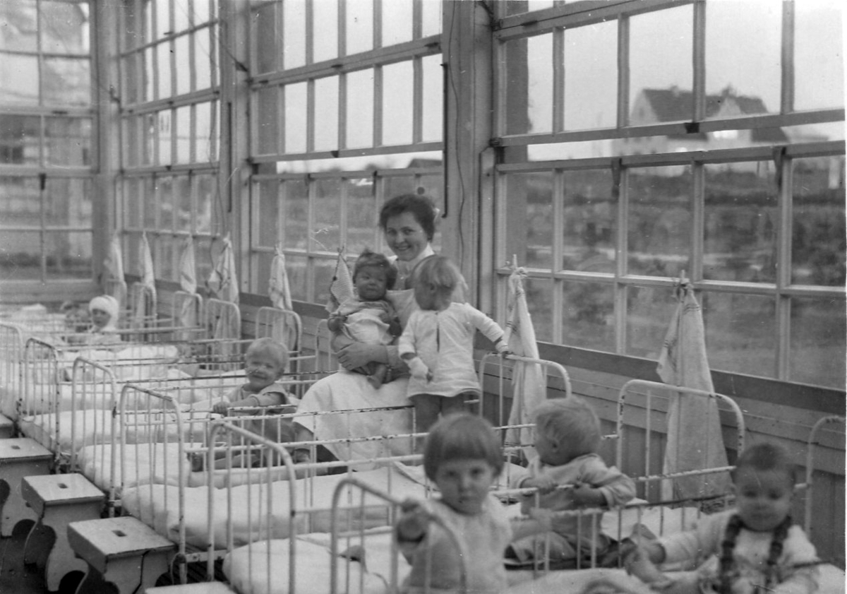 En sköterska på solverandan hos de minsta tbc-sjuka barnen som vårdas på Kustsanatoriet Apelviken. de sitter i sina sängar som står på rad med träpallar vid gavlarna.